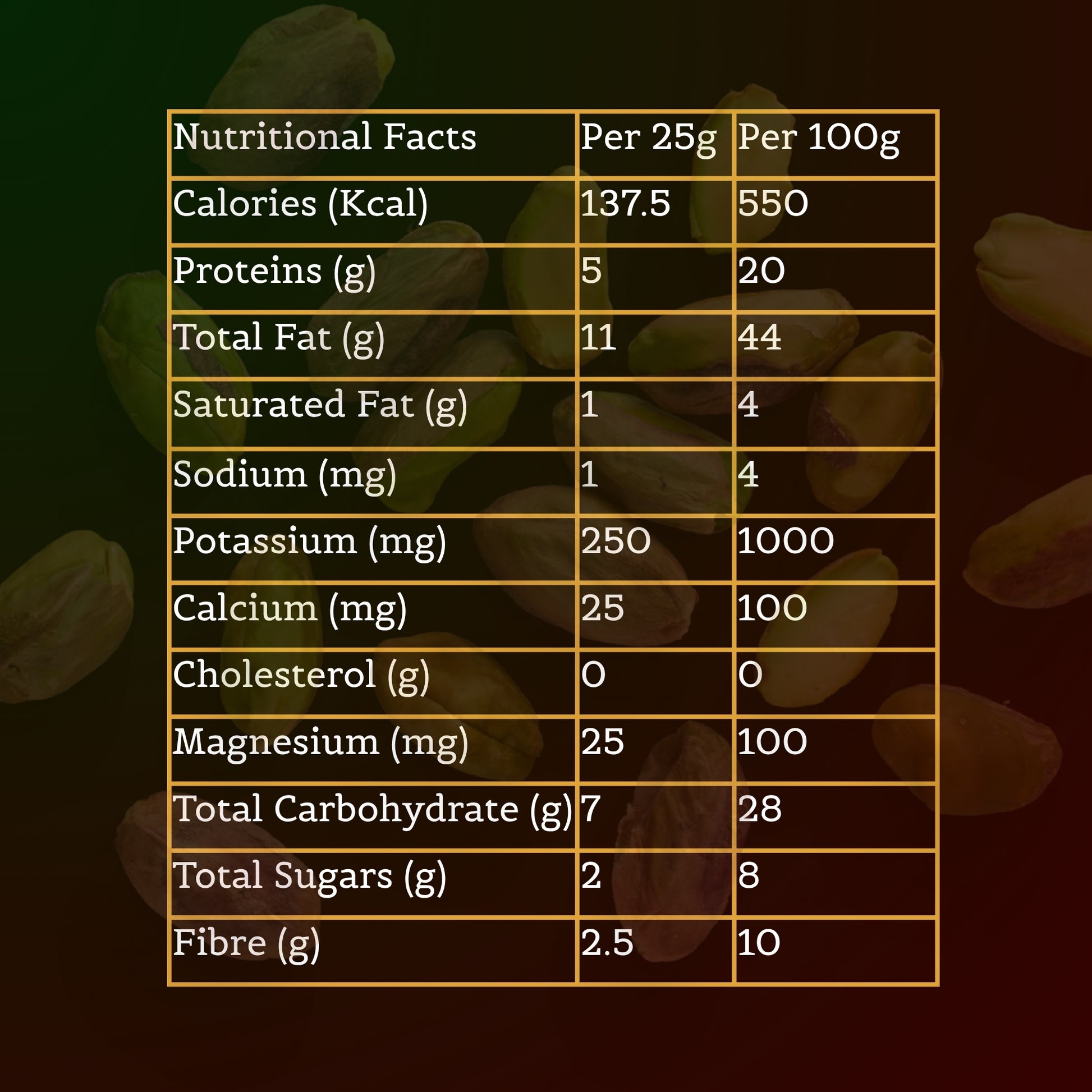 | Pistachios | Brain Boost (Cognitive Function), Muscle Support, Heart Health, Antioxidant Rich | Healthy Fats, Protein, Fiber, Vitamins B6 and E |