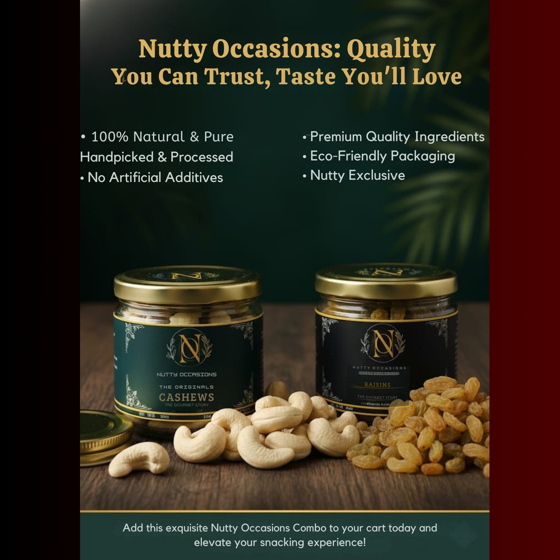 Step into a world of exquisite taste with the Nutty Occasions Premium Combo, featuring our signature 'The Originals' Cashews and Sweet & Tangy Raisins. This is more than a snack—it's an exclusive journey for the palate, designed for those who appreciate the finer things in life. Perfect for gifting or a moment of everyday luxury, this collection transforms ordinary snacking into an extraordinary indulgence.