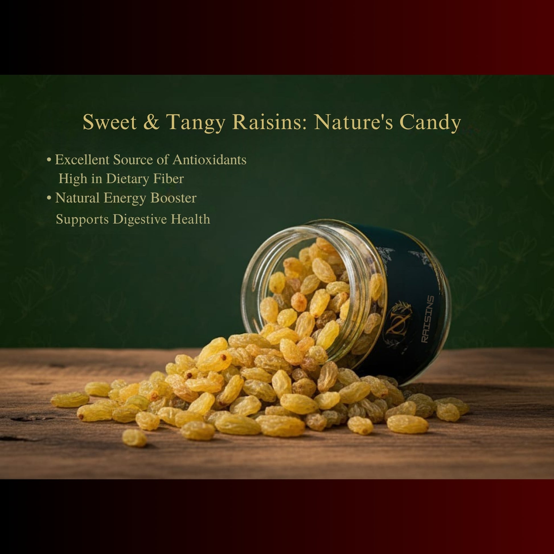 🍇 Sweet & Tangy Raisins: Nature's Candy: Discover the vibrant flavor of our premium green raisins. These sun-dried gems are an excellent source of antioxidants and dietary fiber, serving as a natural energy booster and supporting digestive health. Their sweet and tangy profile is a captivating balance of flavors.
