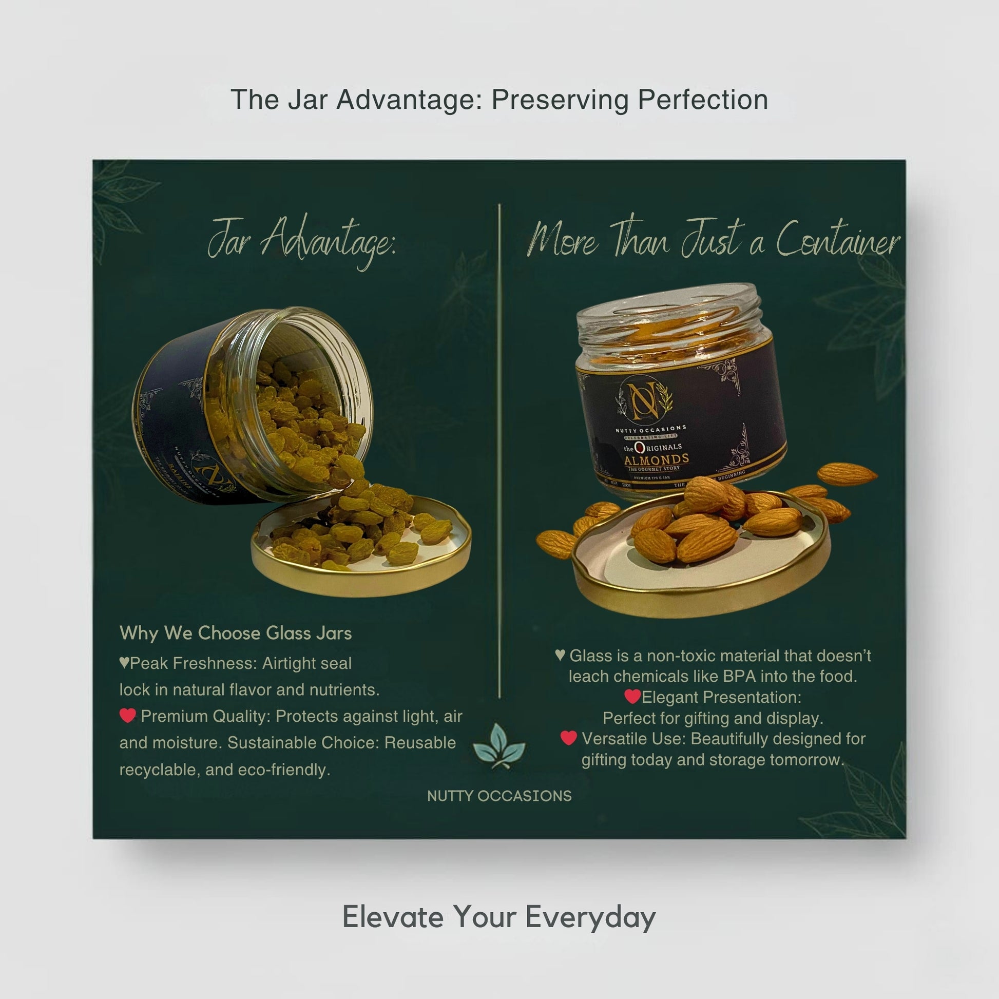 Sustainability Meets Sophistication: Our commitment extends beyond the product. Both 'The Originals' Almonds and Raisins are perfectly presented in premium, reusable glass jars. Glass is a non-toxic, elegant solution that preserves peak freshness while keeping our promise of being Planet-Positive and Zero-Waste.