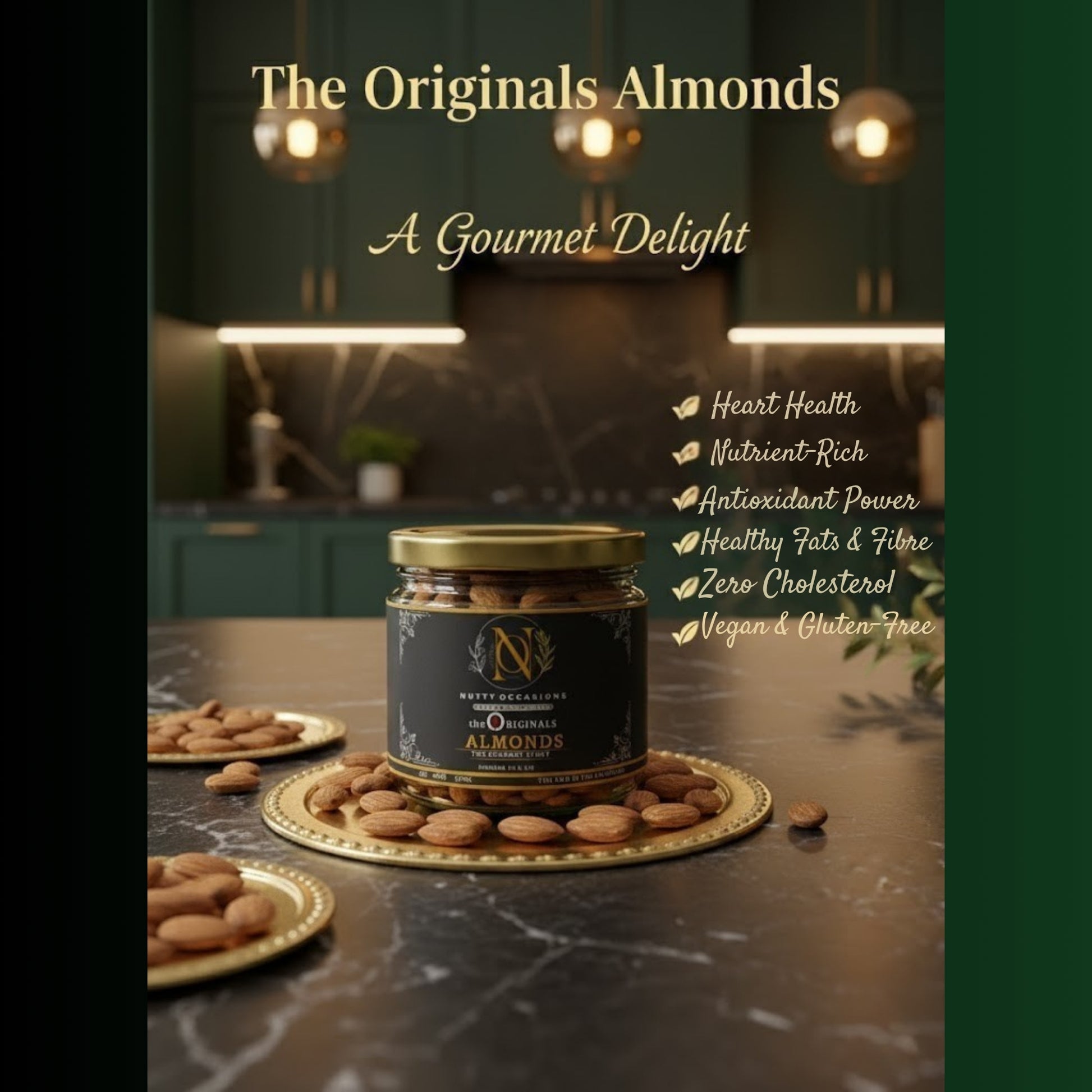 The Originals Almonds: These are not your everyday nuts. Grown in select orchards, our almonds boast a delicate, buttery crunch and a depth of flavor that speaks of natural richness. They are a nutrient-rich, zero-cholesterol delight—a truly wholesome indulgence.