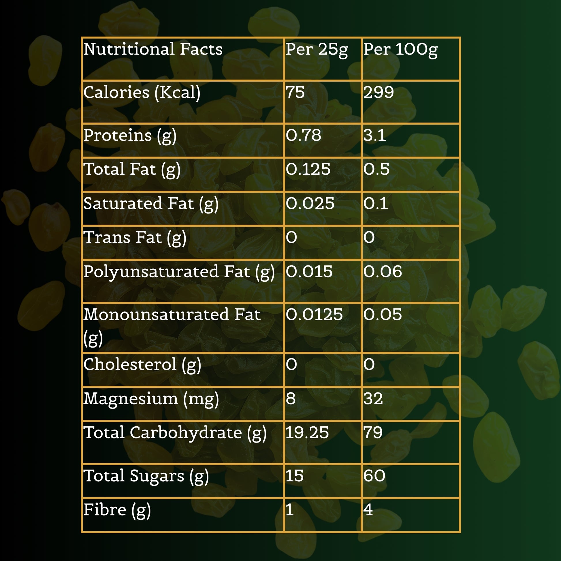 Sweet & Tangy Raisins: Plump, golden, and sun-drenched, these raisins are nature's candy in its purest form. Their bright, tangy sweetness balances the almond's richness, offering a gourmet counterpoint that is high in fiber and a natural energy booster.