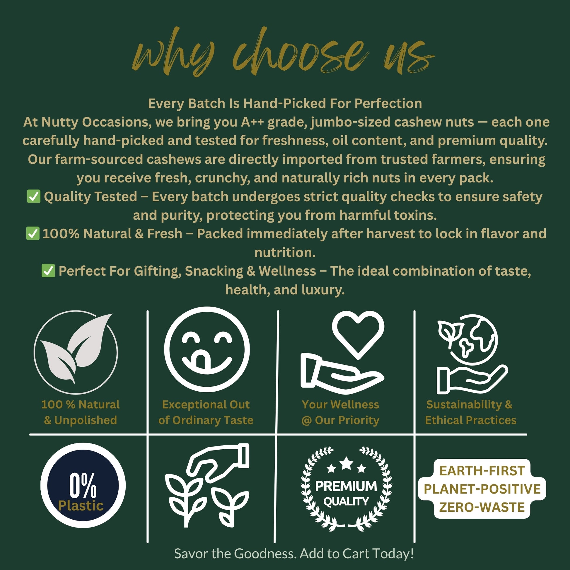 Welcome to The Originals Collection by Nutty Occasions, where every jar is a testament to meticulous sourcing and unrivaled quality. This is more than just a snack; it is an exotic, daily indulgence. We begin The Gourmet Story at the source, partnering with trusted farmers to bring you A++ Grade nuts that are Handpicked for Superior Quality.