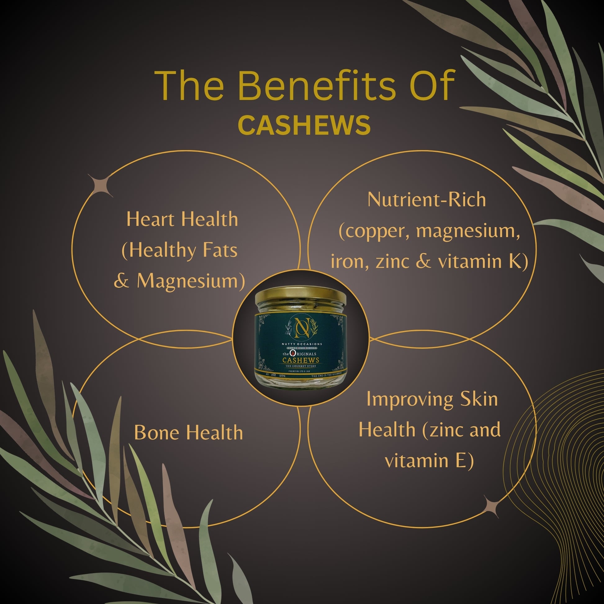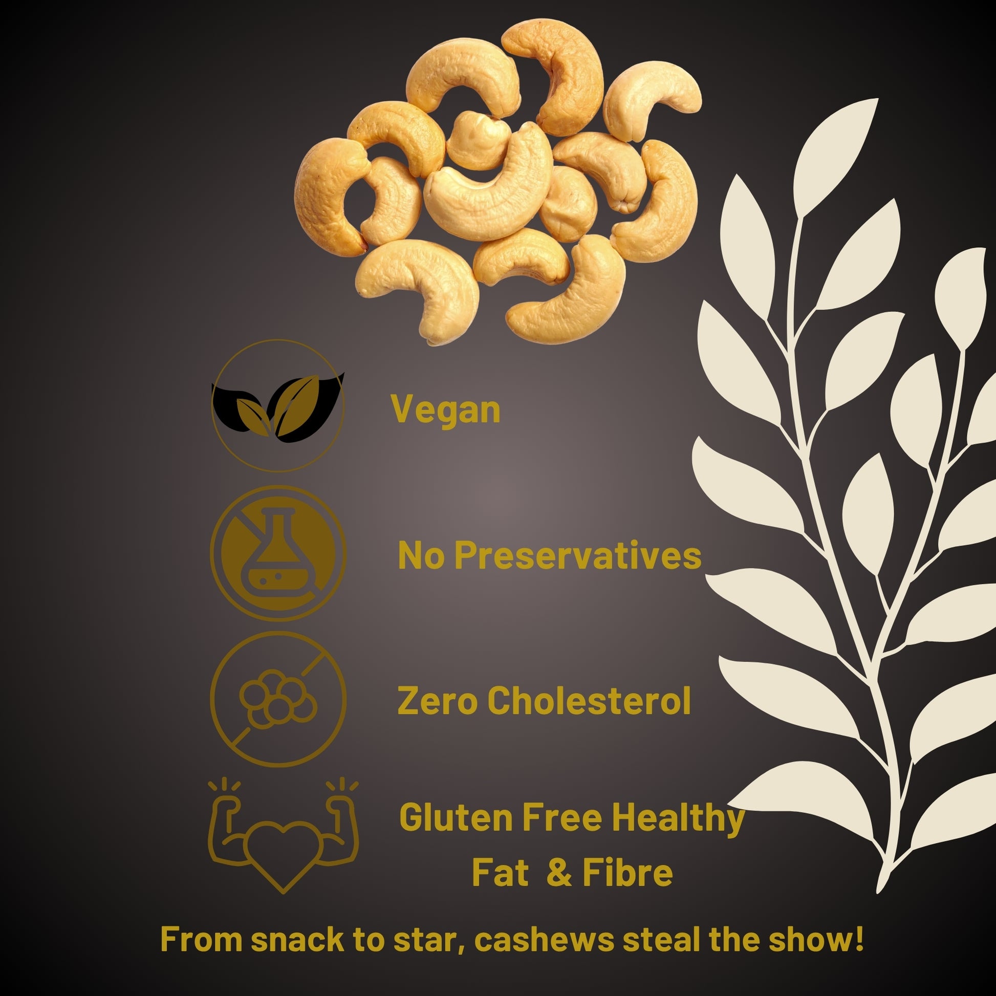 Perfect for those looking for roasted / raw cashews , each bite is packed with plant-based protein, magnesium, and heart-healthy nutrients — a low-cholesterol, vegan, and gluten-free snack made for mindful indulgence.