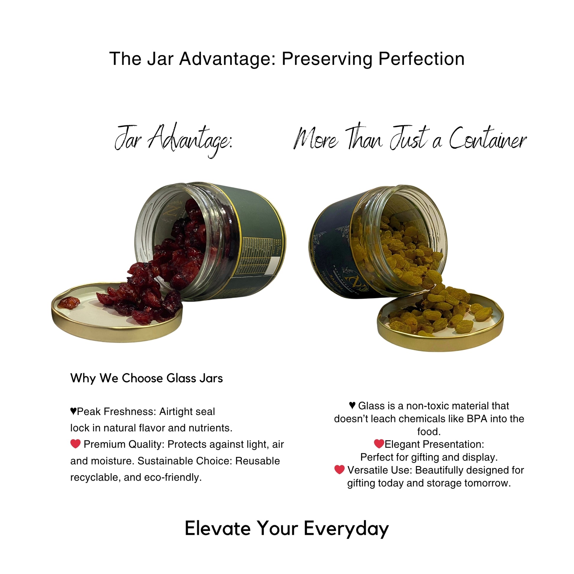 Elegance and Freshness: Our airtight, reusable glass jars provide a Peak Freshness seal that locks in natural flavor and nutrients, protecting against light, air, and moisture.