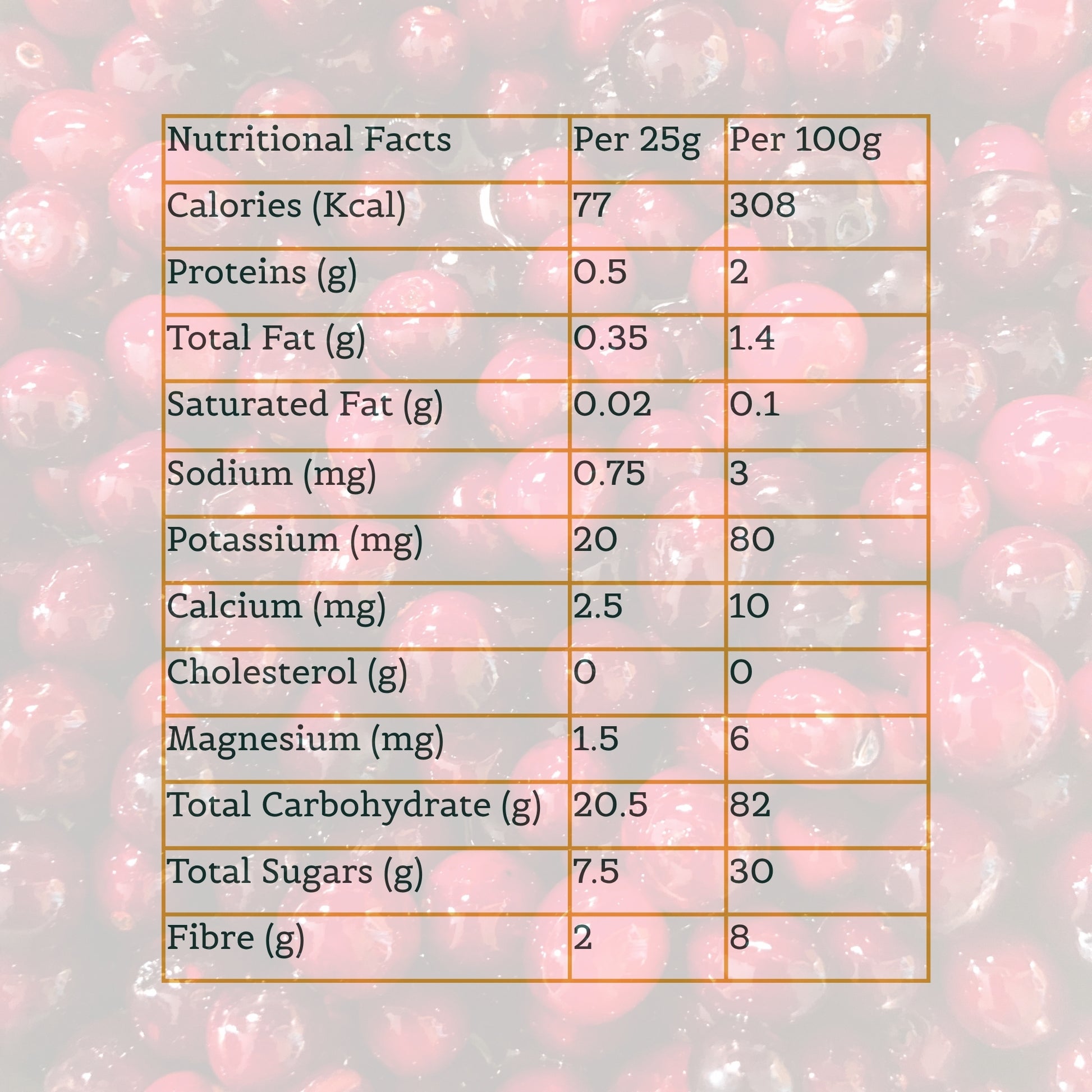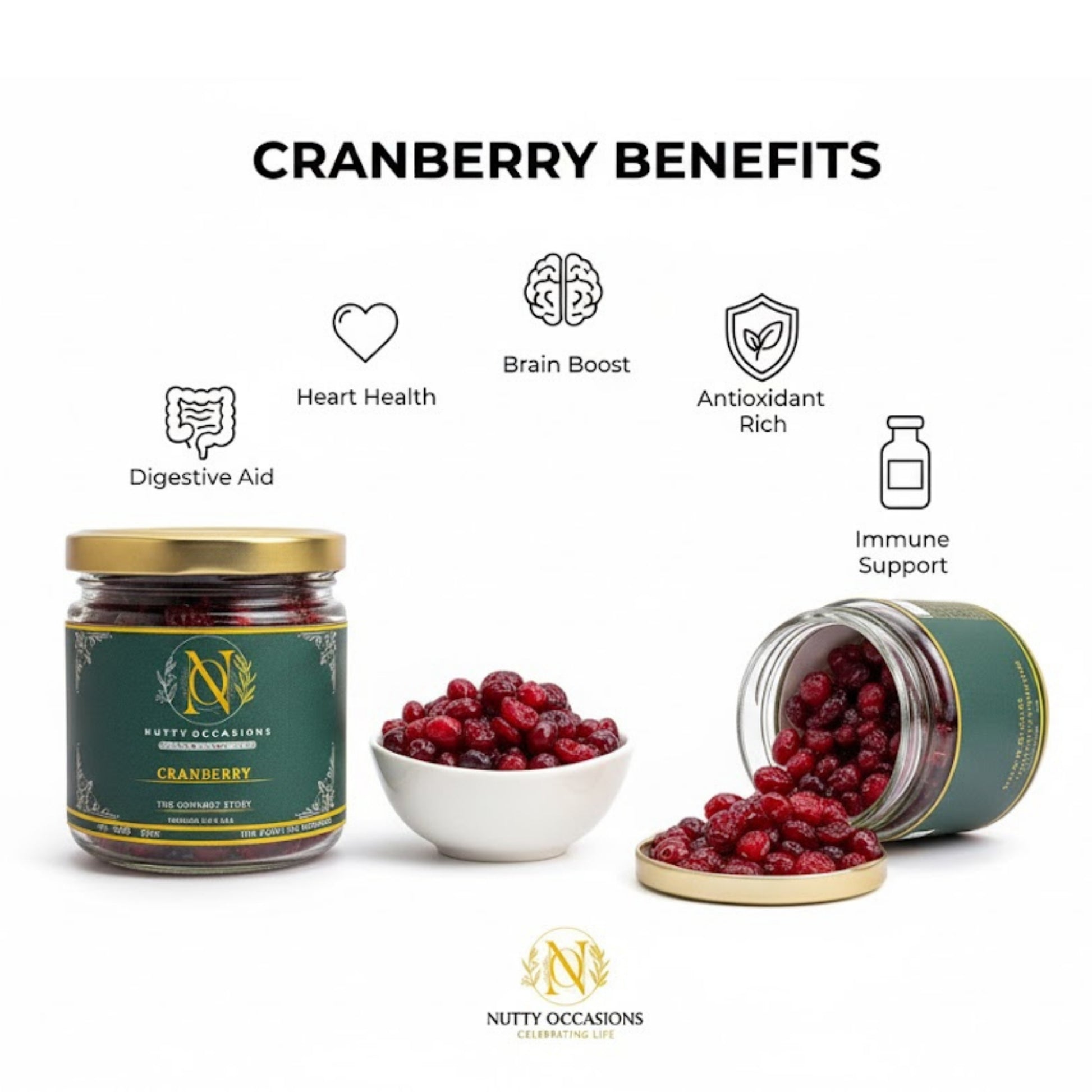 Crimson Cranberries: Experience the tangy, vibrant burst of our plump, antioxidant-rich cranberries. They offer a sophisticated zest that is a delightful boost for Heart Health and a proven Brain Boost.